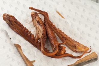Копченые щупальца осьминога – блюдо, которое станет украшением застолья. Мягкий и нежный вкус мяса сочетается с кремово – розовым оттенком. Продукт – кладезь полезных микроэлементов и кислот: белок, фосфорная кислота и омега – 3 кислоты.